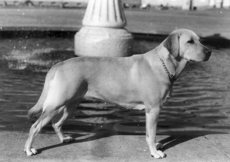 Wenn man sein Foto betrachtet, wird man feststellen, dass ich meinem Typ treu geblieben bin. Wer wird heute hinter diesem Foto einen Poolstead - einen Hund aus sogenannten reinen Schaulinien - vermuten. Die heutigen Poolsteads sehen nicht mehr so aus. Damals konnte man noch zu Recht behaupten, dass jeder Labrador arbeitet. Timber gehörte der Prinzessin zu Sayn-Wittgenstein und sie hatte für meine Bitte, ihren Rüden HD- röntgen zu lassen, Verständnis. So war Timber dann der zweite Labrador in Deutschland, der auf freiwilliger Basis HD- geröntgt wurde. Das Ergebnis war gut und lautete verdächtig für HD (heute Grenzfall, fast normal oder B).