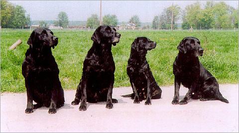 Einflussreiche Field Trial Champions FTCh. Ben of Mallowdale, FTCh. Swinbrook Twig, Symington Coral und FTCh. Tibea Tosh (v.l.n.r.) Foto: Vreni Ommerli